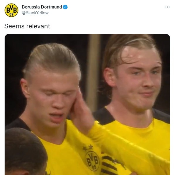 随后多特官推蹭了一下此事的热度。他发布了一段罗伊斯在庆祝进球时扇了哈兰德一巴掌的视频,并配文:“看起来差不多。”